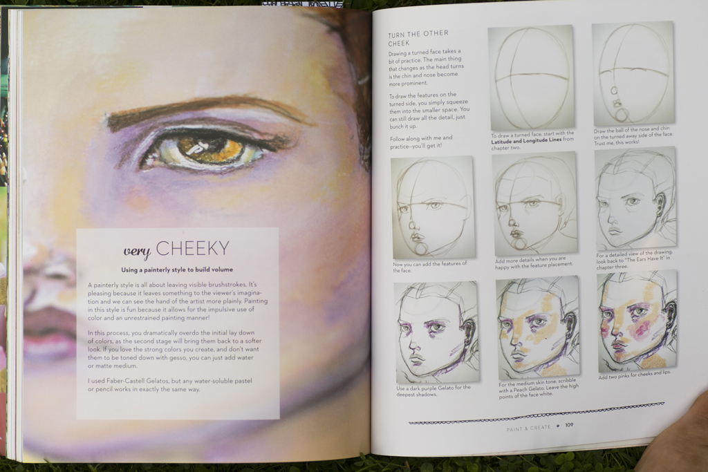 W pierwszej Jane opisuje swoje „tools of the trade”, czyli narzędzia których używa i które poleca. Bardzo fajny rozdział, bo podaje dokładne nazwy produktów. Także dla osoby początkującej jest to niewątpliwy plus – masa wskazówek czego poszukiwać. Jane stosuje technikę mix-mediową, a więc: zaczyna od szkicu kredką (ołówka w swoich pracach nie używa), potem maluje po tym szkicu mediami, a na samym końcu znów używa kredek do wykończenia pracy.