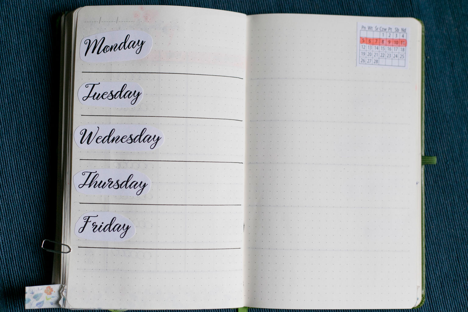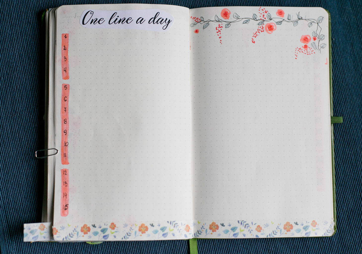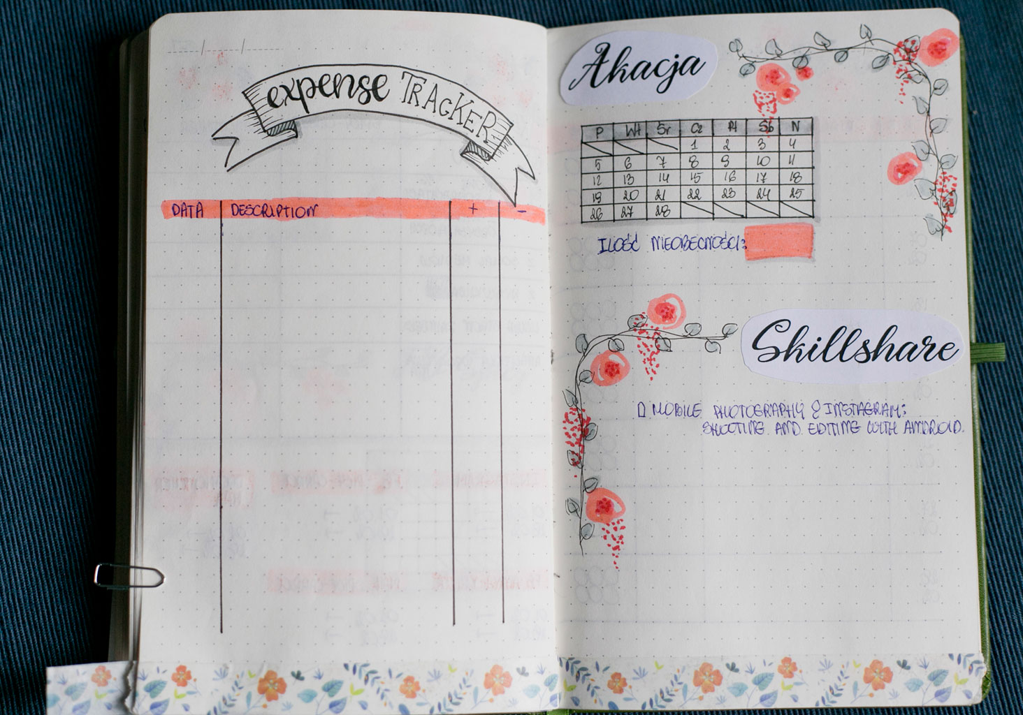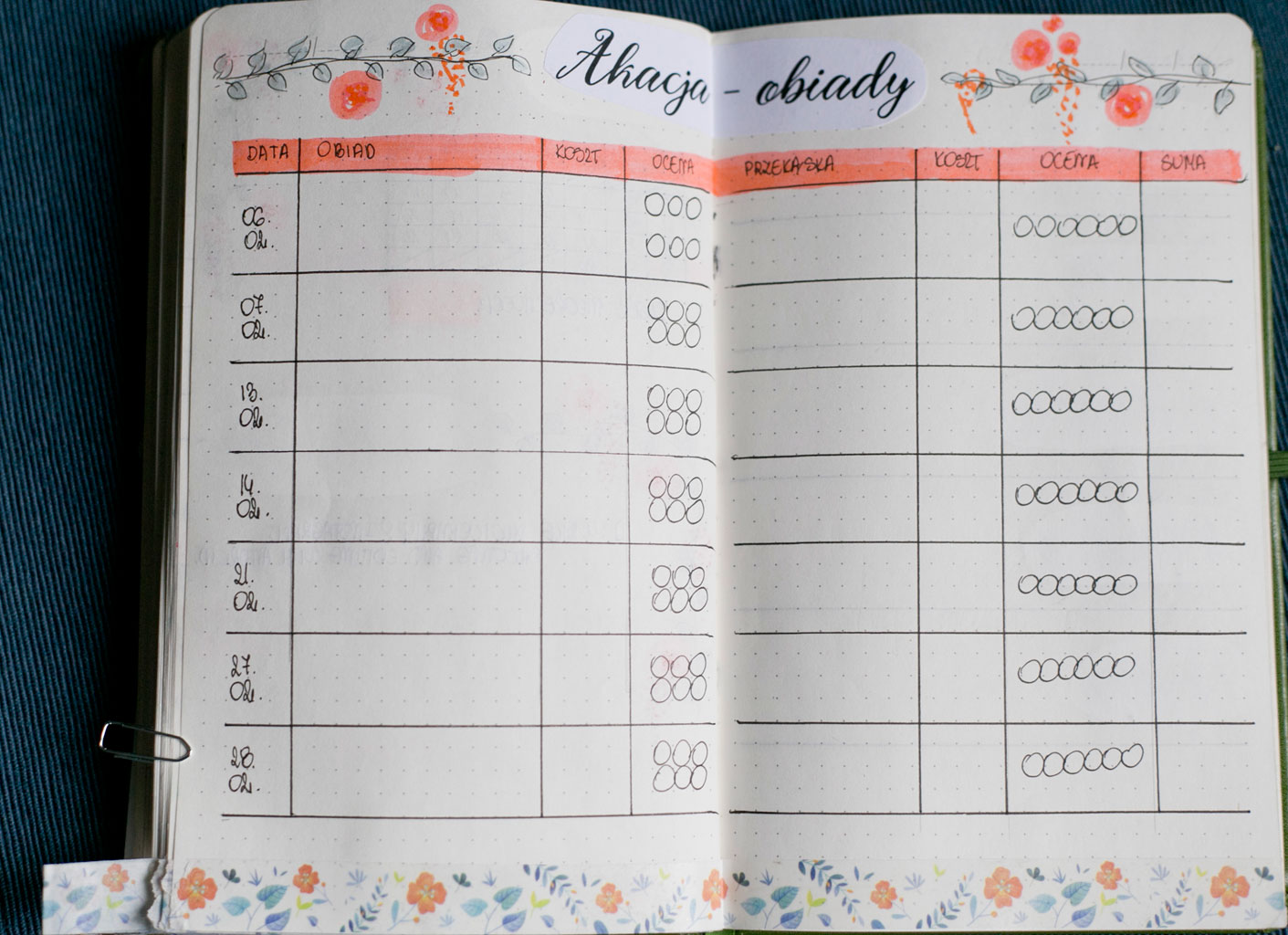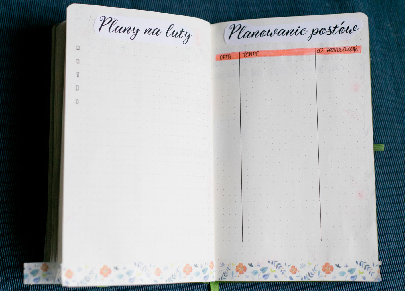 Póki co nie dorobiłam się strony tytułowej. Jak znajdę chwilę to ją sobie rozrysuję, choć nie jest najważniejsza. Każdy początek miesiąca oznaczam sobie nowym wzorem taśmy washi, tak by było łatwo go znaleźć. Wszystkie strony danego miesiąca również są ozdobione tą samą taśmą, by mi się nie mieszały rozkładówki. W poprzednim notesie łapałam się na tym, że wertowałam wszystkie strony w poszukiwaniu najważniejszych informacji i nie zawsze wiedziałam, czy jestem we właściwym miesiącu.