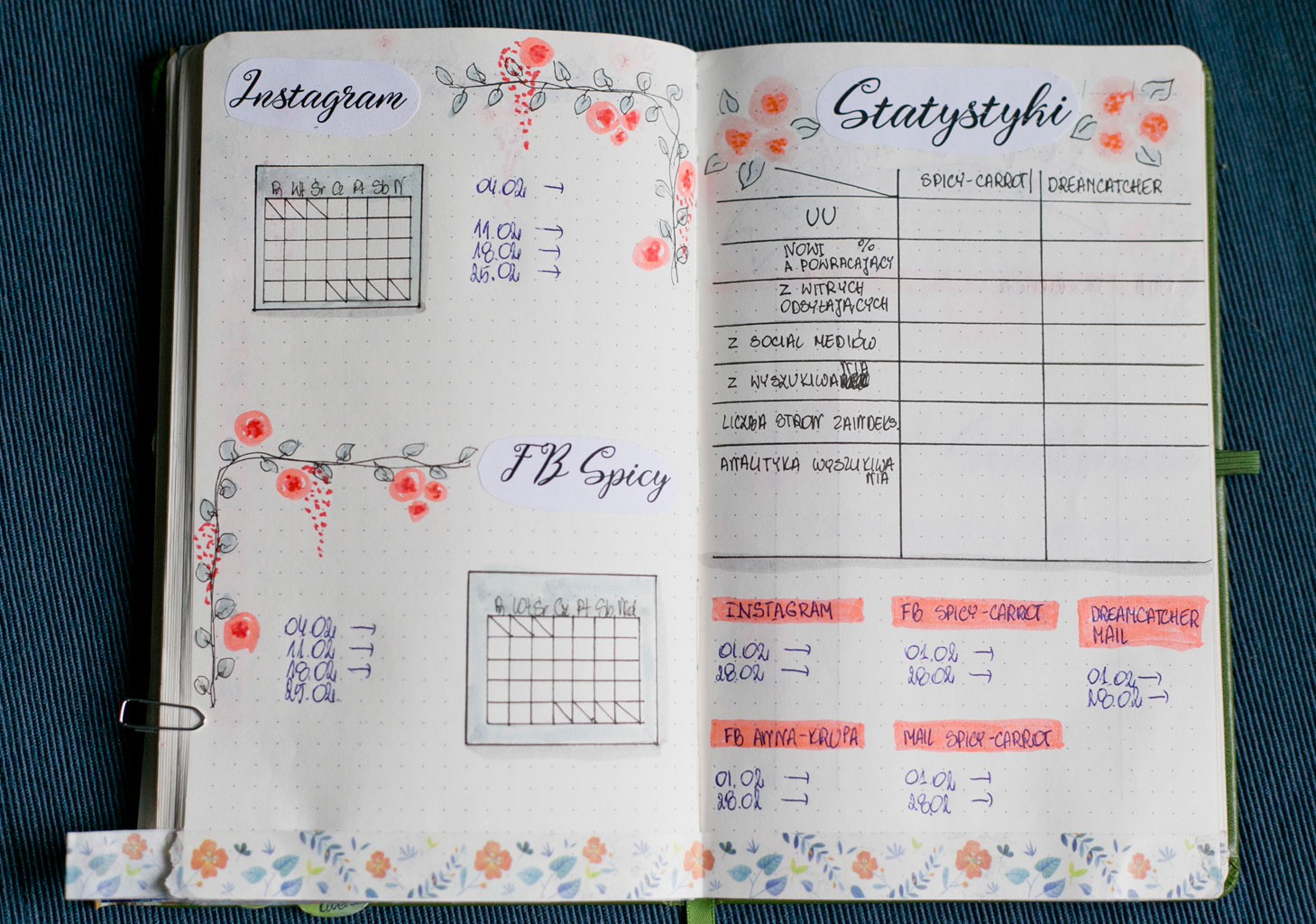 Początkowo moje rozkładówki były bardzo proste. Bałam się cokolwiek malować w swoim notesie (by go w moim mniemaniu nie zniszczyć). Przyglądałam się jak ozdabiają swoje strony inni, między innymi na instagramie, czy na grupach na facebooku. I powoli, powoli zaczęłam się przełamywać. Aczkolwiek i tak staram się, by to ozdabianie nie zajmowało mi za dużo czasu, bo w moim planowaniu wszelkie ozdobniki są jedynie dodatkiem. Dodatkiem, który ma mi uprzyjemnić pracę z moim plannerem.