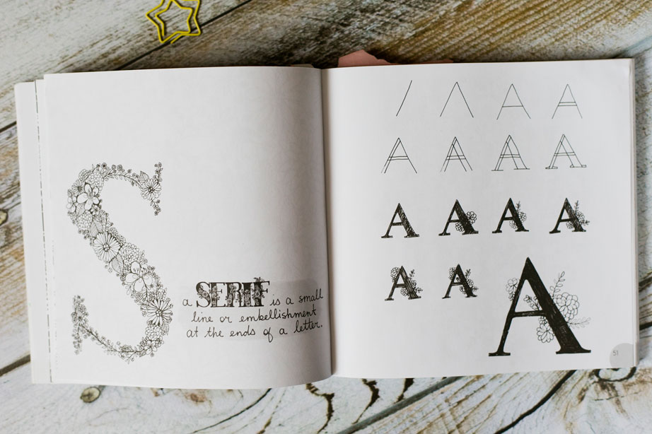 Pokazane są tu również różne rodzaje botanicznych alfabetów, zarówno szeryfowych jak i bezszeryfowych. Uważam, że pod tym względem ta pozycja to świetny zbiór inspiracji. Jedyne co mi się tu nie podoba to ilość miejsca przeznaczonego na własne alfabety – jest zdecydowanie za mała. Mi osobiście ciężko byłoby się wpasować między dwie linijki, tym bardziej używając brushpena. Choć prawda jest taka, że i tak większość ćwiczeń wolę wykonywać we własnym szkicowniku. Nic mnie wtedy nie ogranicza, nawet strach przed tym, że coś mi nie wyjdzie.
